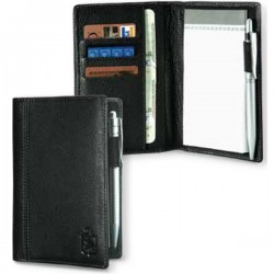 Business card holder. Elastic pen loop. Includes 3"x4.75" Scripto writing pad. Refills available. 5.25" H x 3.5" W x 0.5" L..